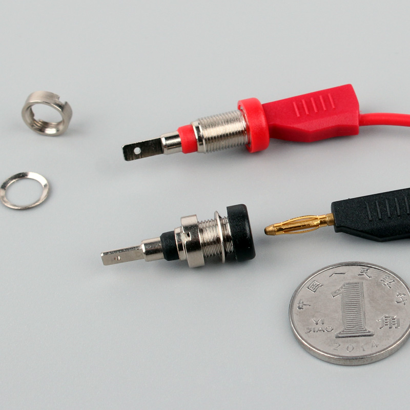 純銅鍍鎳嵌入式2mm輸入端子,采用金屬螺帽直接在面板進行固定,耐高溫尼龍塑料,尾端建議使用插片連接。