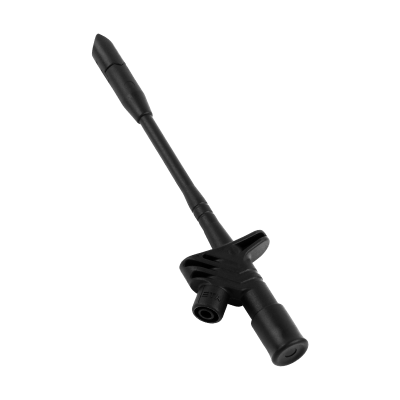 在某些情況下無法找到被測點而必須破開電線外皮對信號測試時,可以方便地使用這個工具,ETA3406全絕緣快速穿孔測試夾可穿透0.25至1.5mm2絕緣電線( ? 3.5mm ),獨特的V型線槽設計,確保測針的位置保持在電纜中間,尾部4mm插座可與萬用表或示波器的測試引線一起使用,簡單,安全,高效。使用方法就將4mm測試線纜插入穿刺測針的末端,測試電纜放入V型線槽中,松開按鈕,測試工具內的一個非常精細的探頭可以刺穿電纜護套和內導體直接接觸,從而在電纜內部進行信號快速無損檢測,測試后,松開按鈕,拆下電線,電纜護套留下針孔可實現絕緣自愈。