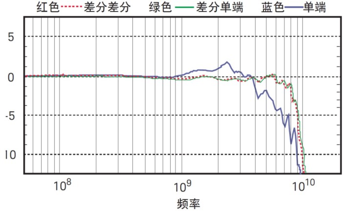 當差分探頭受單端源驅動時,您可用疊加法確定總響應。當 vcm = vp = vm 時,在電路中施加單端信號。對于疊加的第一項,把 vcm“關閉”;對于疊加的第二項,把 vp 和 vm“關閉”。第一項是單端信號差分部分的響應,因此該響應和前面的討論一致。第二項是單端信號共模部分的響應,因此其響應決定于探頭的共模抑制。如果探頭有良好的共模抑制能力,那么對單端信號的總響應就只是對單端信號差模成分的響應。如果探頭的共模抑制不好,就會看到測量差分信號和測量單端信號的響應差異。從圖 4 可以看到,這些響應實際上并無差別。