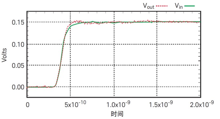 圖 5 顯示了對于輸入約 100 ps 上升時間的階躍信號,差分探頭所測得的時域響應。圖 6 顯示了對于輸入約 100 ps 上升時間的階躍信號,單端探頭所測得的時域響應。在這兩個圖中,紅色軌跡是探頭的輸出,綠色軌跡是探頭的輸入。應注意這不是探頭的階躍響應,而只是測量它們能在多大程度上跟蹤 100 ps 的階躍信號。為測量階躍響應,輸入必須是非常完美的、有極快上升時間的階躍信號,此時差分探頭能顯示出比單端探頭更快的上升時間。這兩種探頭都能很好地跟蹤 100 ps 的階躍信號。