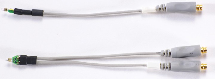 我們用簡化模型 ( 圖 1) 幫助比較,并用探頭放大器配合焊入式差分探頭前端和焊入式單端探頭前端測量數據。這兩種探頭前端的物理連接尺寸非常接近,因此它們的性能差別主要是因為差分和單端電路元件的布局造成的。圖 2 和圖 3 是這些探頭的照片。