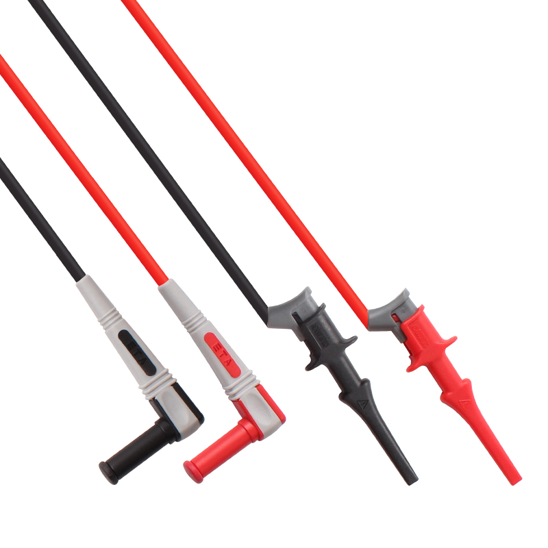 ETA4513雙插轉微型夾線,一端插頭為90度直角型公插,另一端為微型IC夾,測試導線采用多股鍍錫銅線,外包硅橡膠絕緣層,標準插頭兼容具有4mm插頭的儀器使用,廣泛應用于教學儀器、電工電力測試儀器、汽車測試儀器、醫療儀器等。